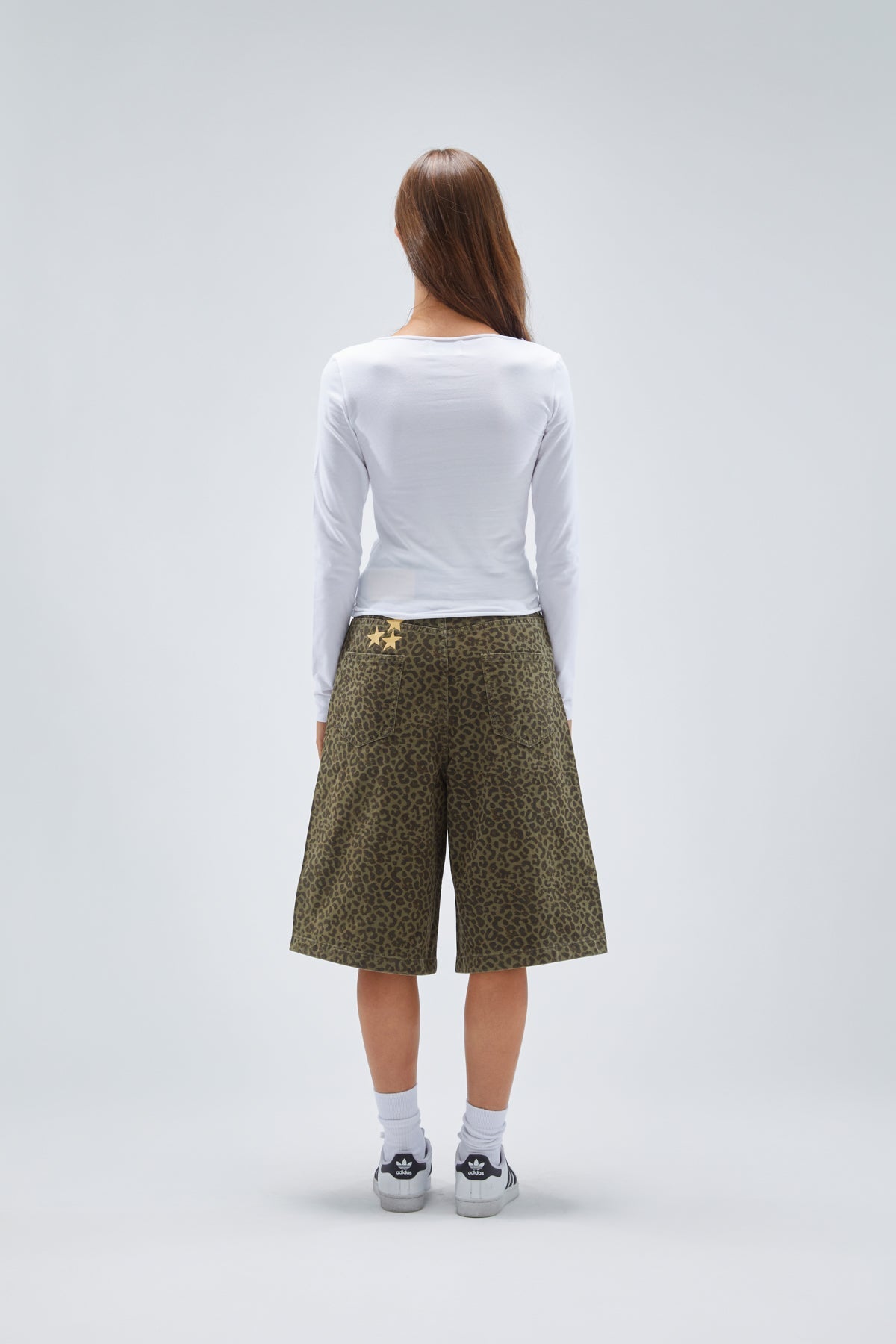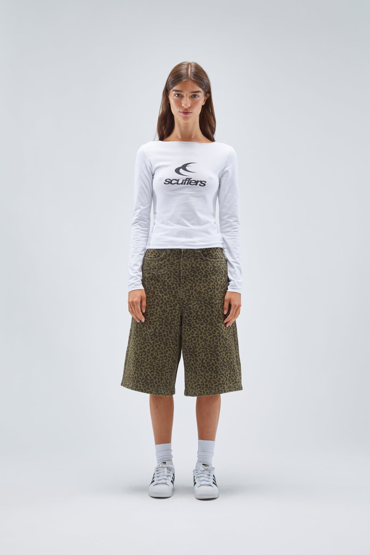Camiseta blanca de manga larga, corte holgado y entallado. Diseño «Scuffers double moon» serigrafiado en negro en la parte delantera.