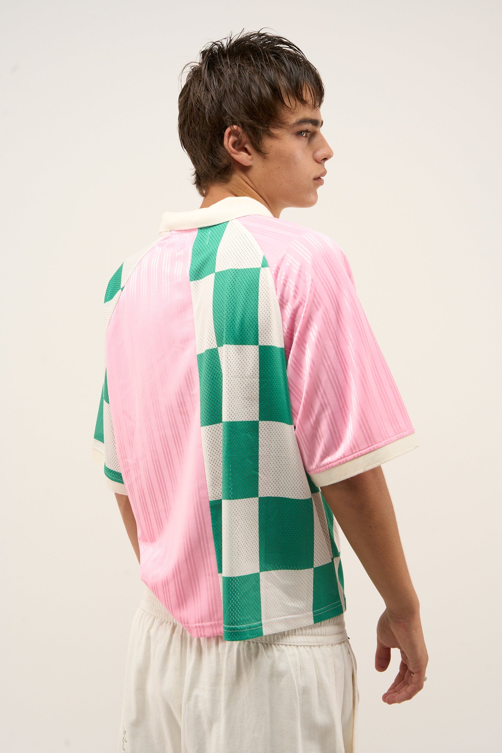 Camiseta de fútbol rosa y a cuadros del Madrid
