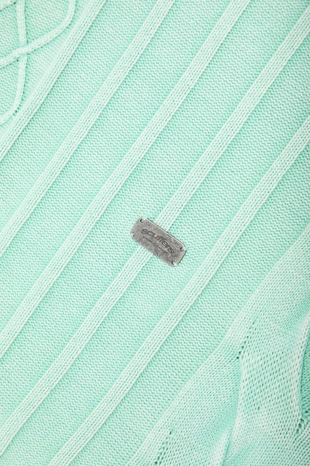 Punto desgastado en verde menta descolorido con una combinación de patrones de ochos y canalé. Confeccionado en tejido suave de grosor medio con un corte holgado. Presenta bordes sin rematar en el bajo y los puños para un aspecto desgastado. Cuello redondo acanalado y un sutil detalle de logotipo metálico en la espalda.