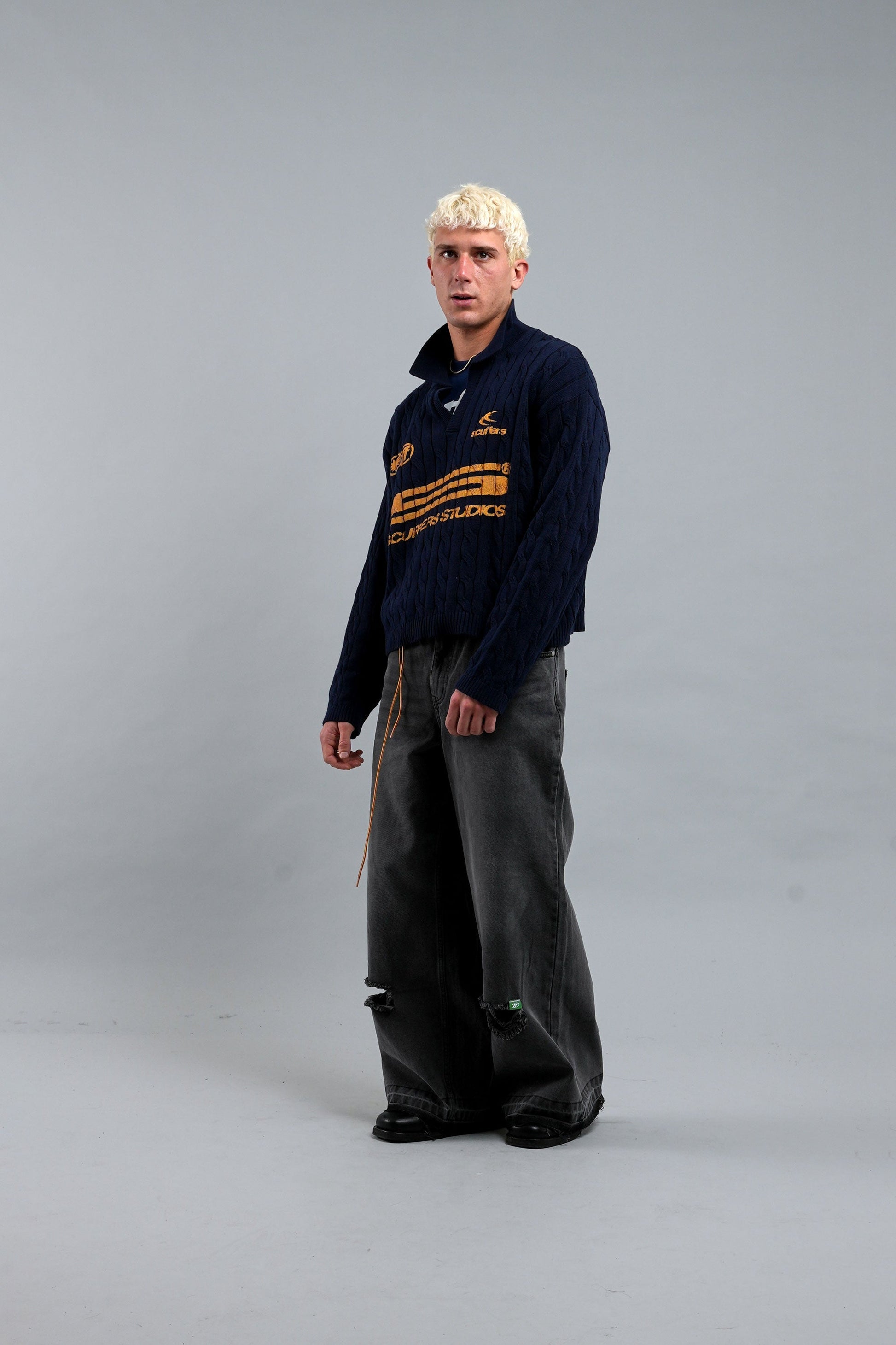 Suéter polo azul marino de punto trenca, confeccionado en algodón suave y transpirable para un ajuste cómodo. Presenta un diseño de punto trenzado texturizado, cuello con tapeta en V y puños y bajo acanalados para mayor estructura. En contraste con llamativos logotipos gráficos en amarillo y detalles de texto en la parte delantera, combina una estética clásica con un toque de marca contemporáneo. Ideal para usar en capas o como prenda individual.